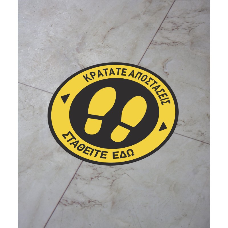 Αυτοκόλλητο δαπέδου "κρατάμε αποστάσεις - σταθείτε εδώ" σε αυτοκόλλητο 100Mic με πλαστικοποίηση μεγάλης αντοχής floor graphic.